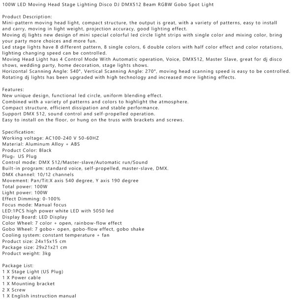 100w Led Moving Head Stage Lighting Disco Dj Dmx512 Beam Rgbw Gobo Spot Light Walmart Ca